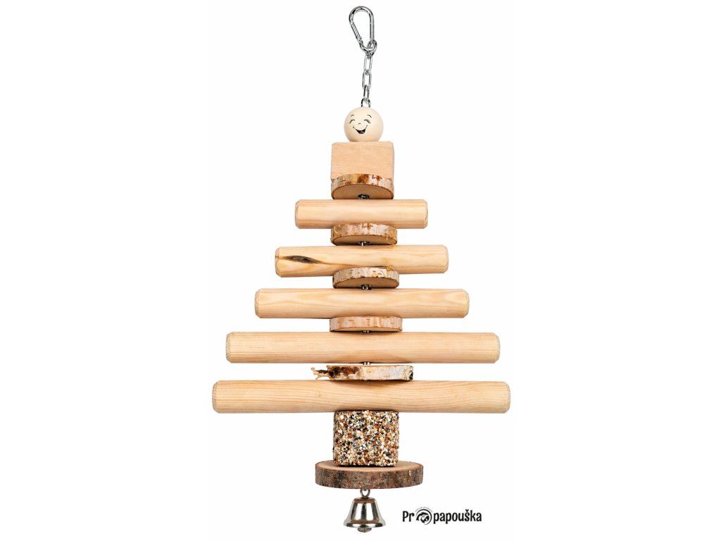 Přírodní závěsná hračka pro papoušky z kvalitního dřeva, která podporuje přirozené chování - okusování, šplhání a hraní.